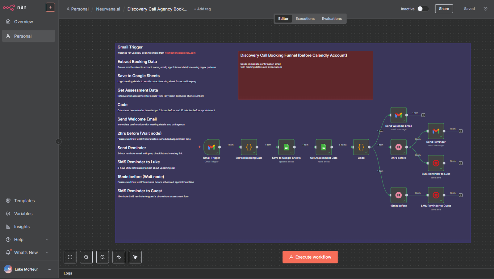 Multi-channel reminder system that sends confirmation emails, 2-hour prep reminders, and 15-minute SMS alerts to both host and guest. Built with n8n to replace Calendly’s premium workflow features, saving hundreds annually while delivering better customization.