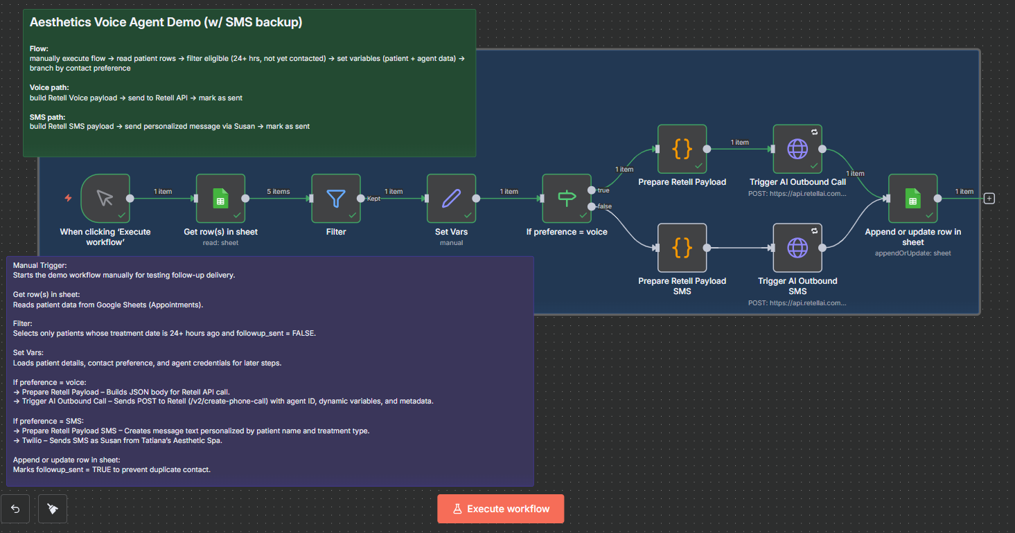 This n8n automation orchestrates the complete follow-up process from patient identification to message delivery. The workflow reads appointment data, filters for eligible patients based on treatment date and contact status, then branches into two paths: voice calls for patients who prefer phone contact, and SMS messages for those who opted for text communication.