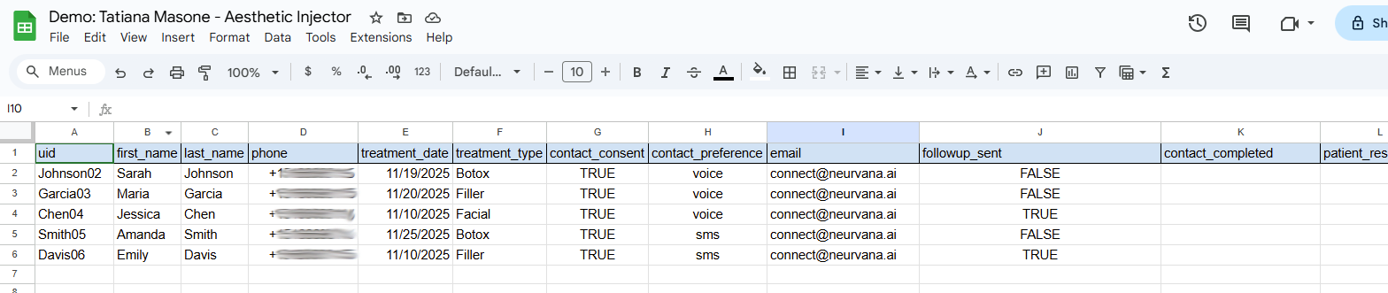 This Google Sheet serves as the central tracking system for all aesthetic treatments and follow-up communications. Each row represents a single patient appointment with complete contact information, treatment details, and communication preferences.